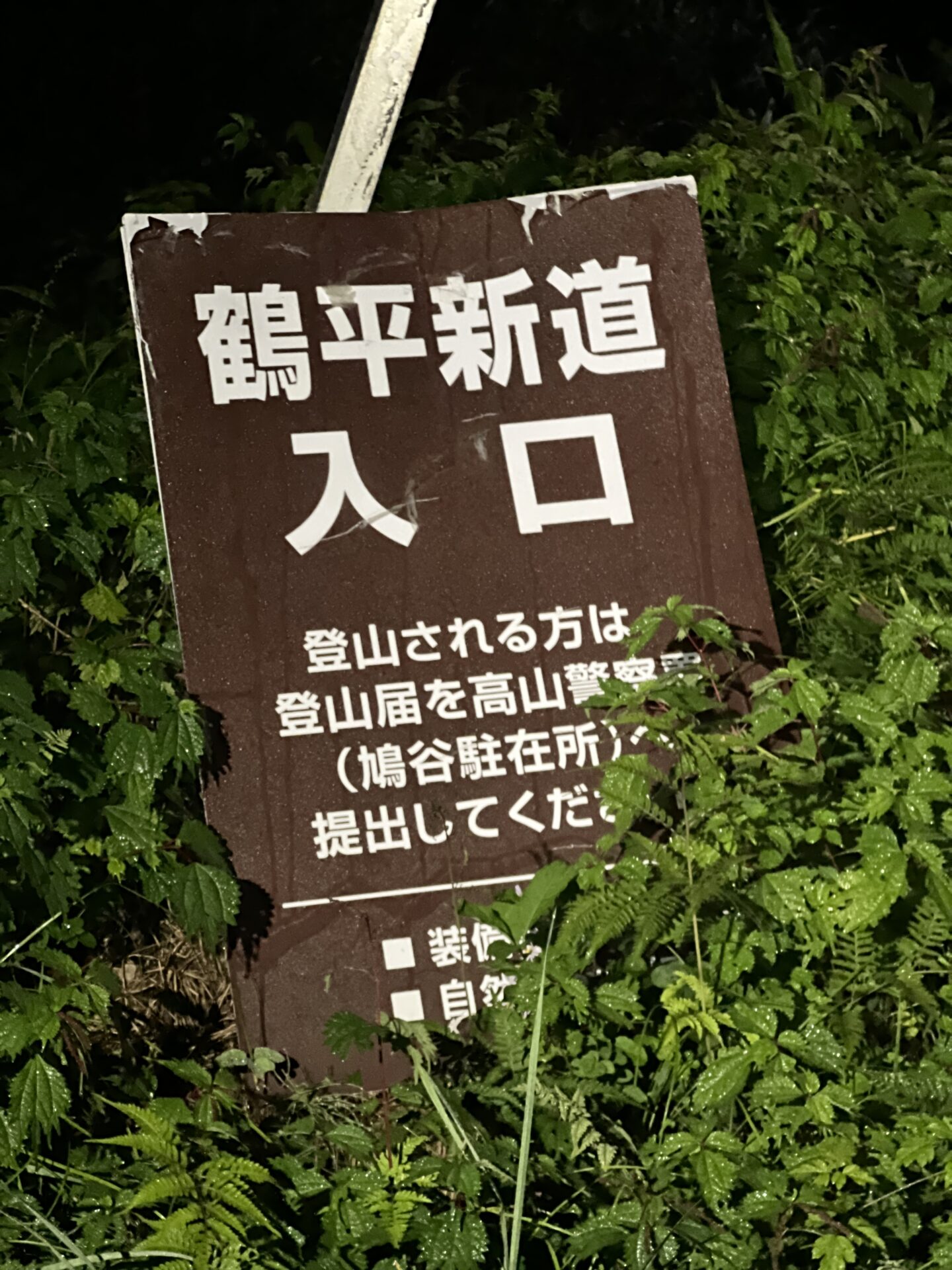 暗闇の中、ヘッデンで浮かび上がる看板。