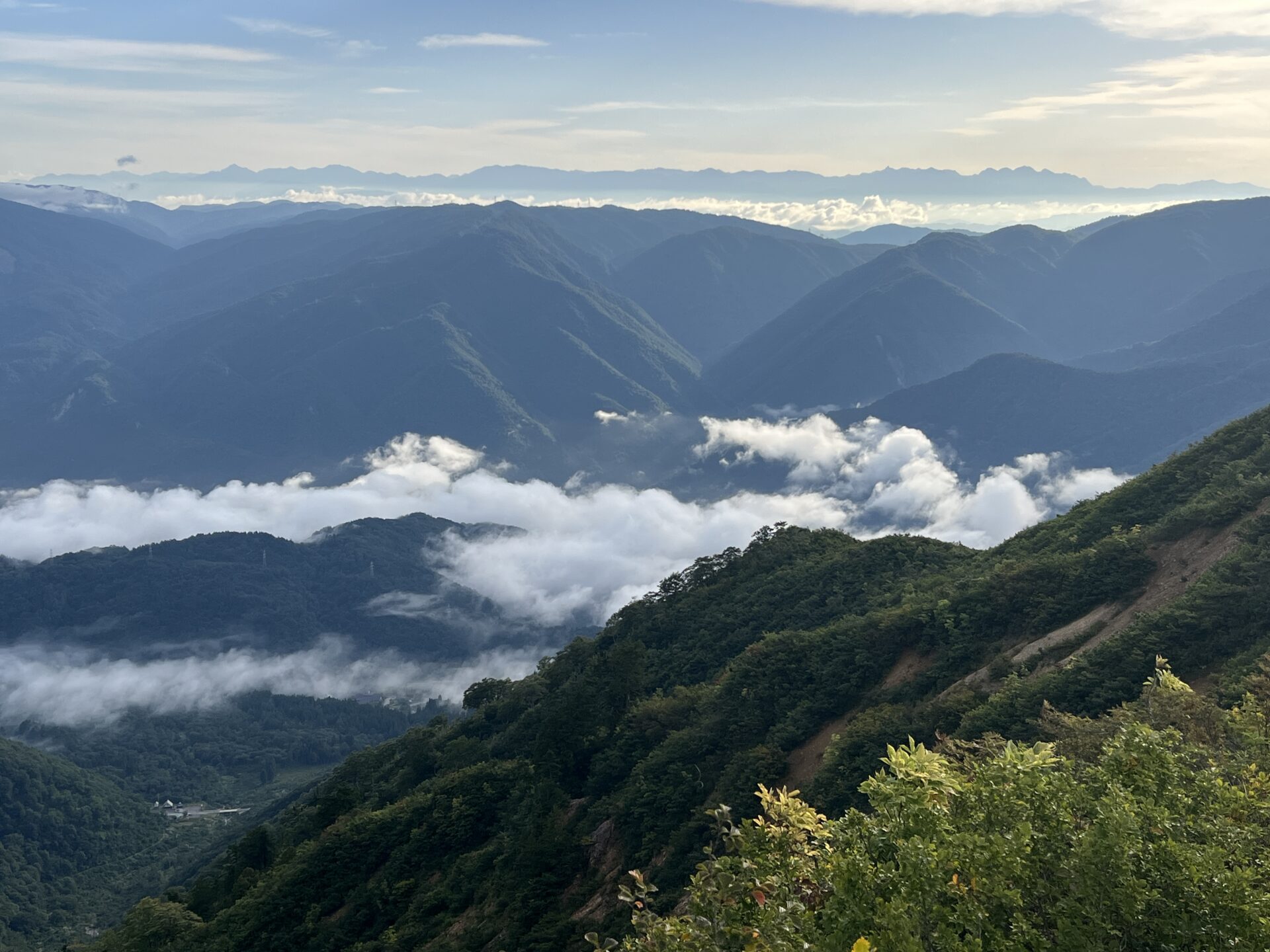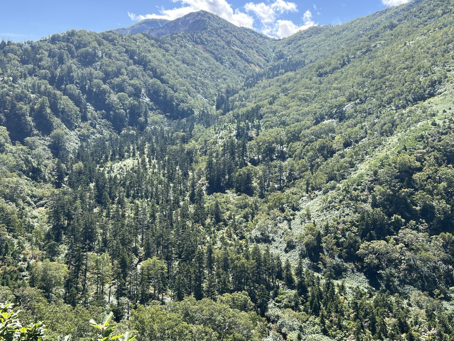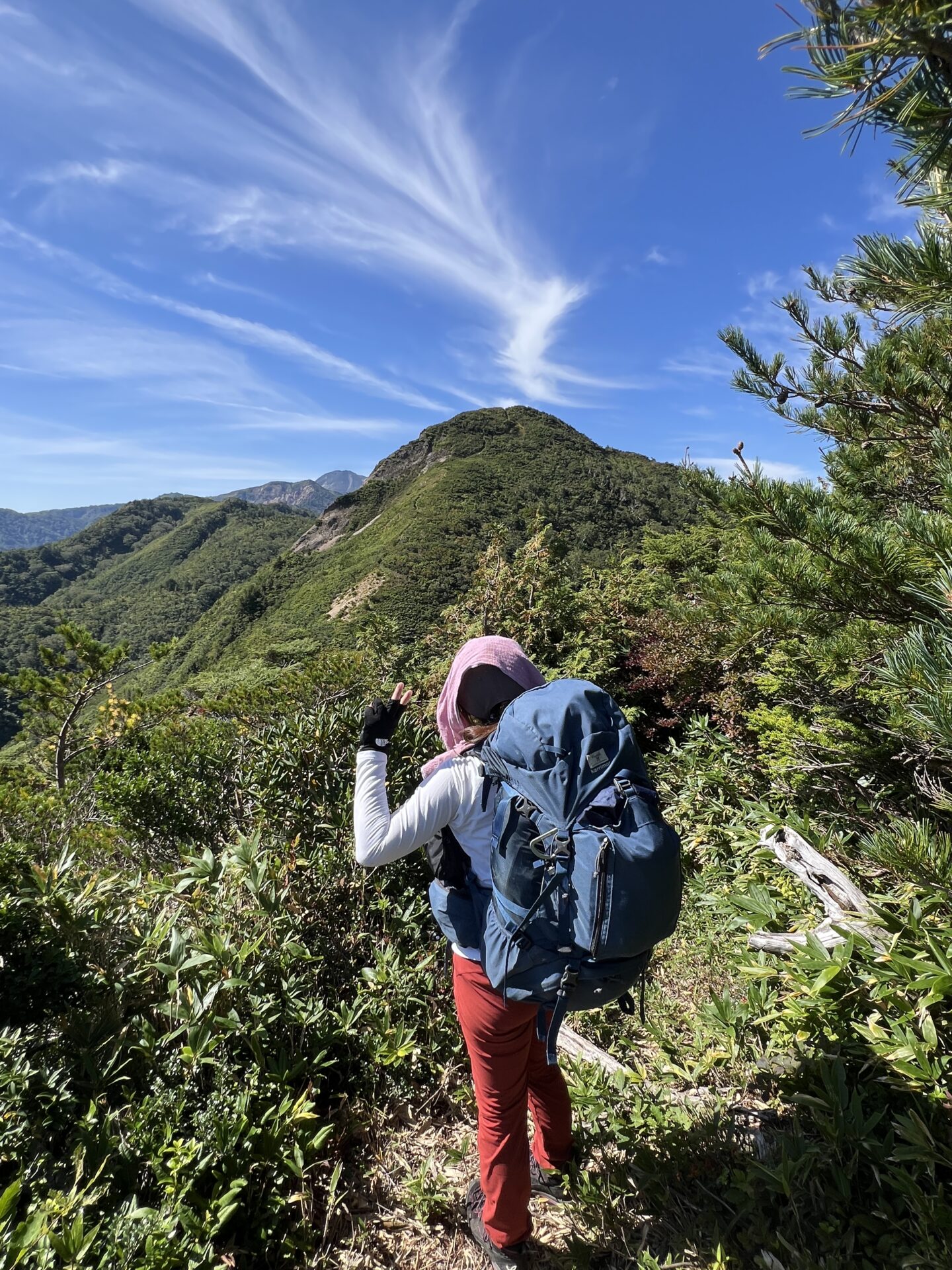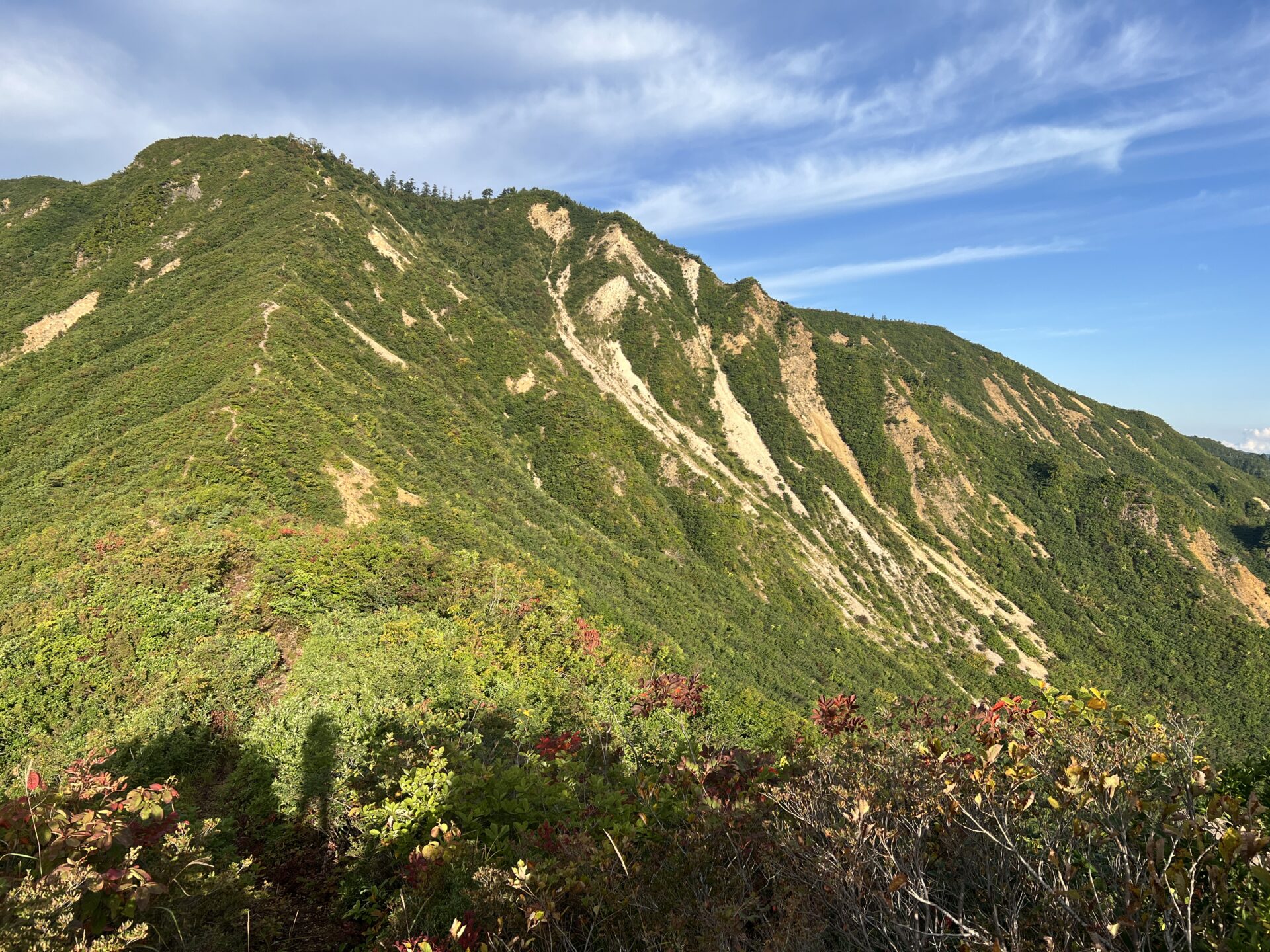 下山後に笹の刈り払いをしてくださったご本人から聞いた話では、笹が人の背丈まで覆いつくし、刈り払わないと藪漕ぎも遭難レベルであったとのこと。北部白山の登山道を管理してくださっている泰山氏へは感謝してもしきれないほどである。同時にこのルートのハードさを実感。本当の核心部はこの区間だった