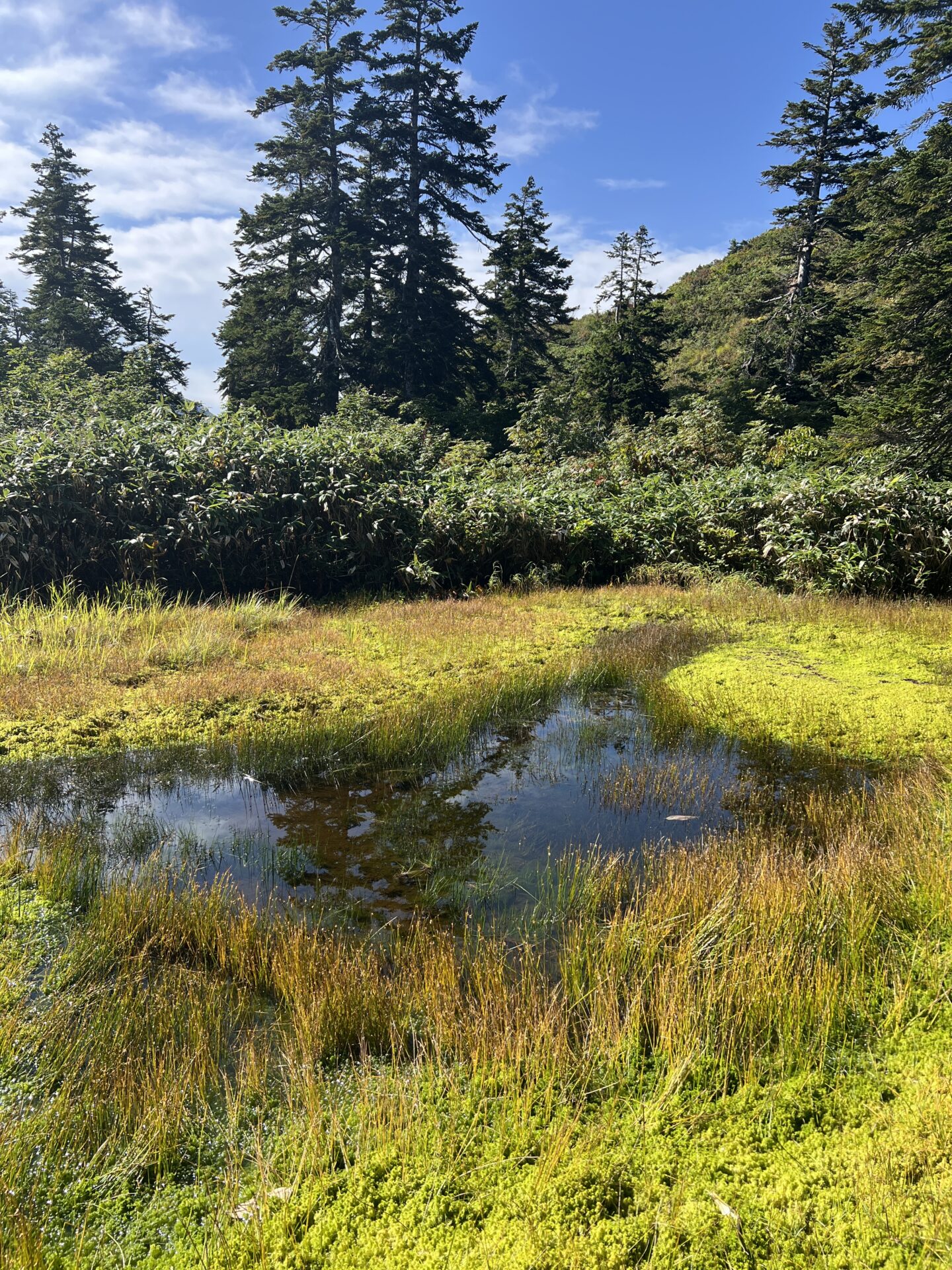 オオシラビソに囲まれ神庭池(かんぼいけ)と呼ばれる池塘の景観がとてもよく山上のオアシスのよう。