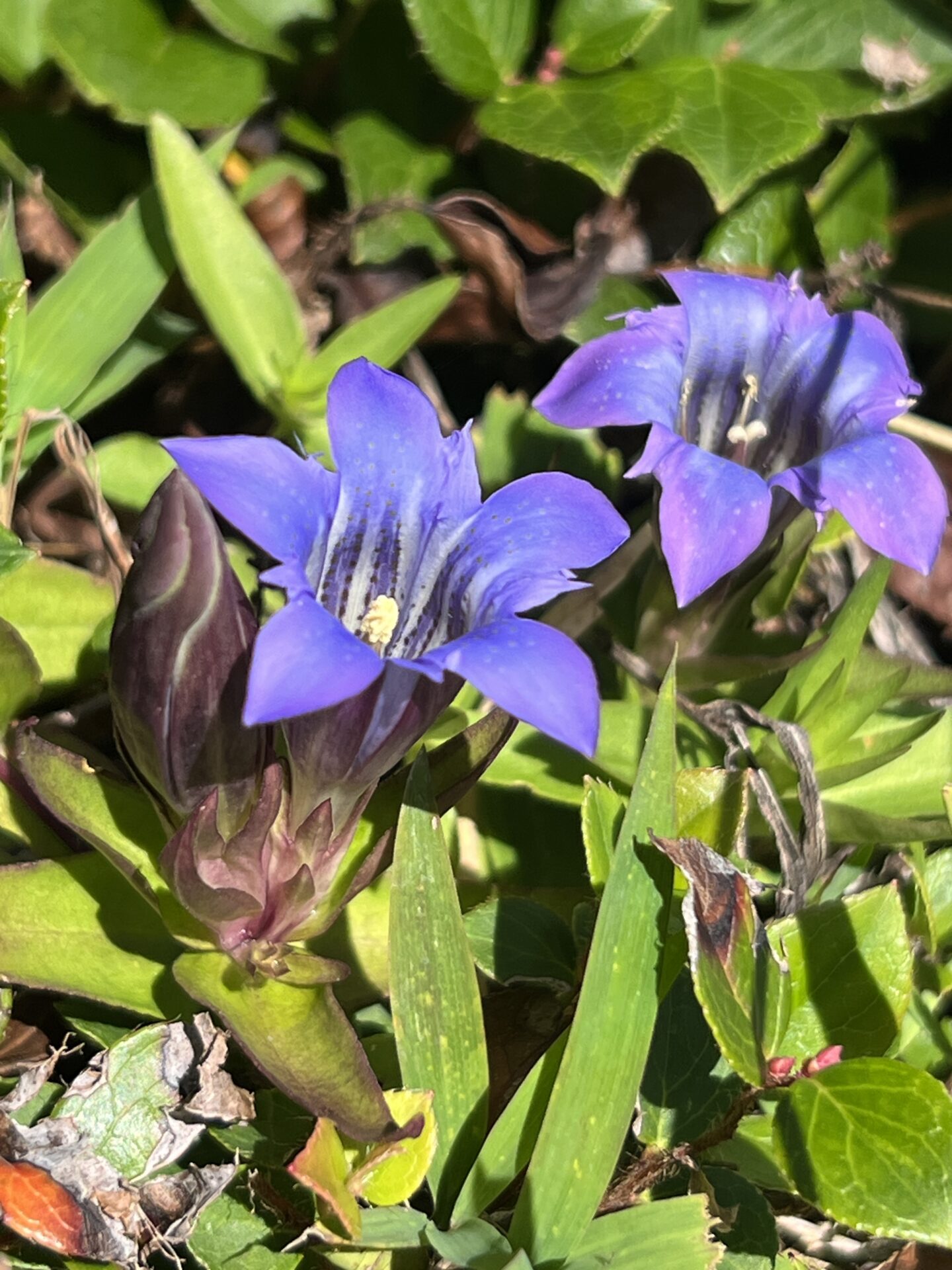 まだ花が開いていないリンドウが複数、池塘をふちどるように生えている。