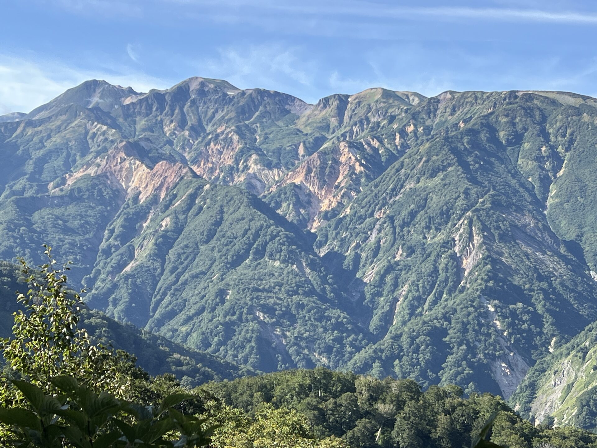 白山ホワイトロードであろう道がくっきり山の斜面にわかる。