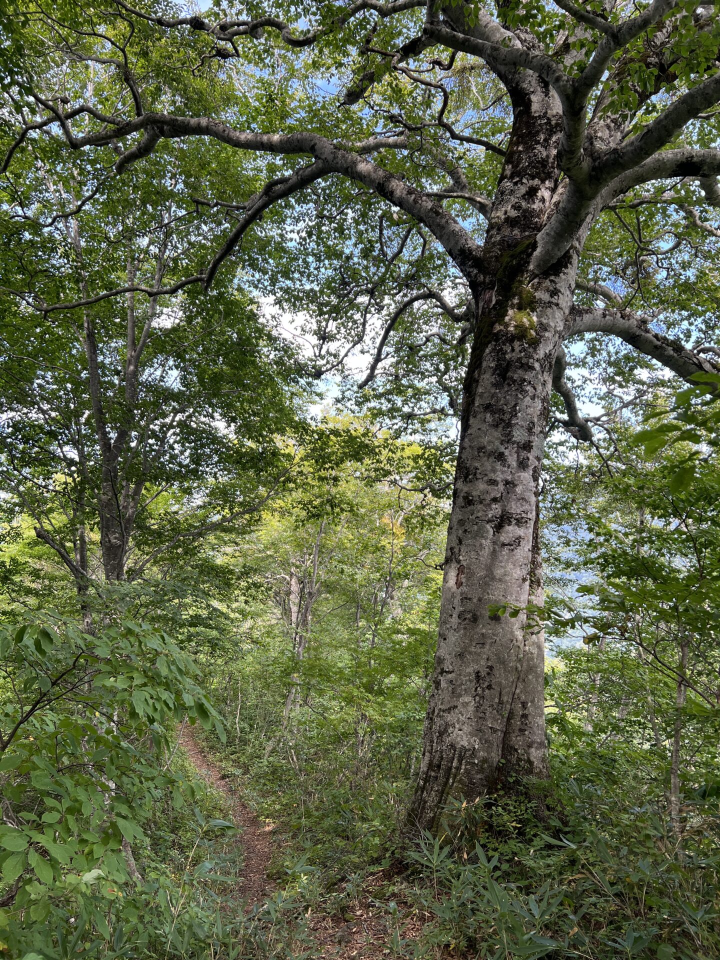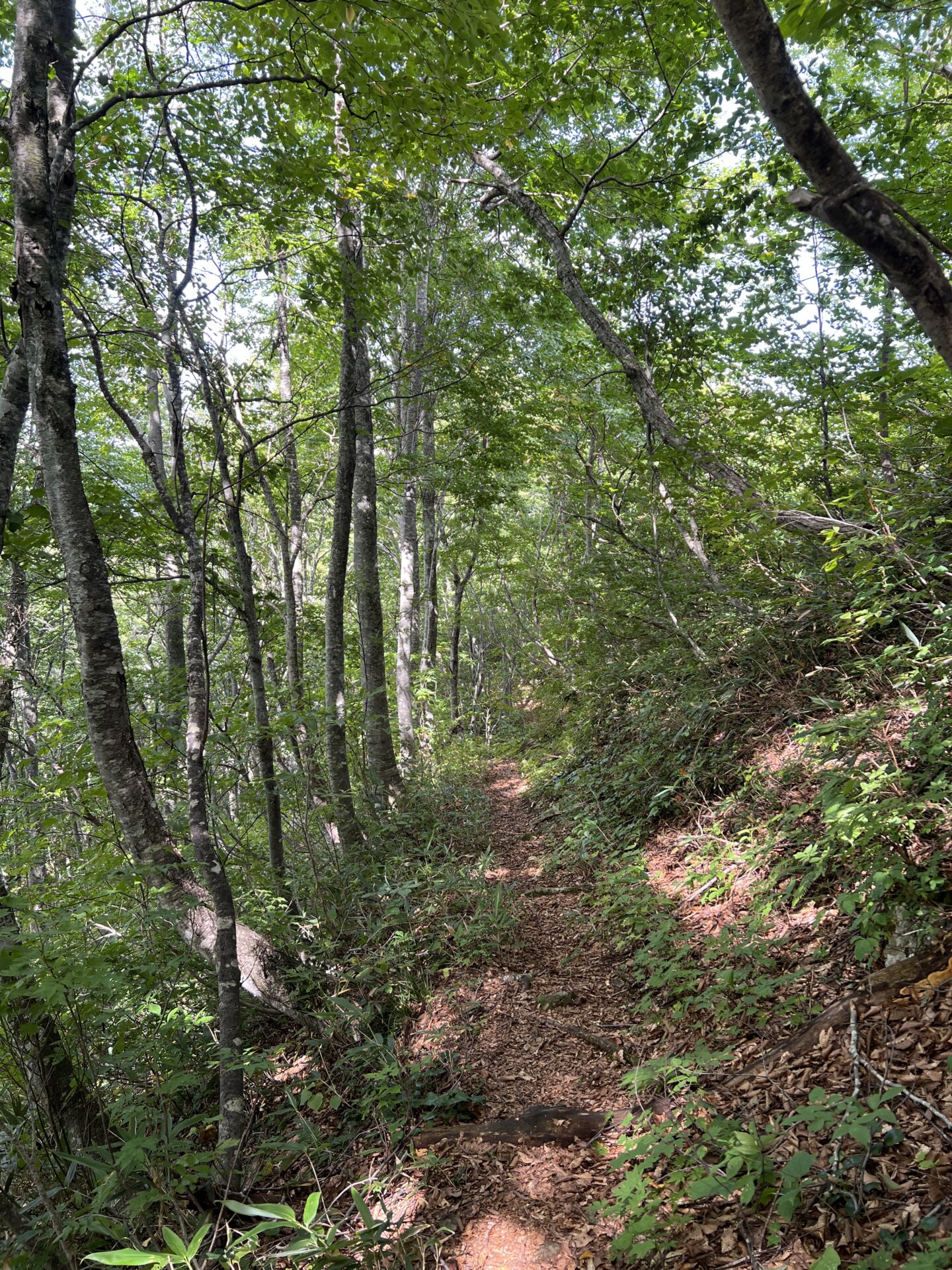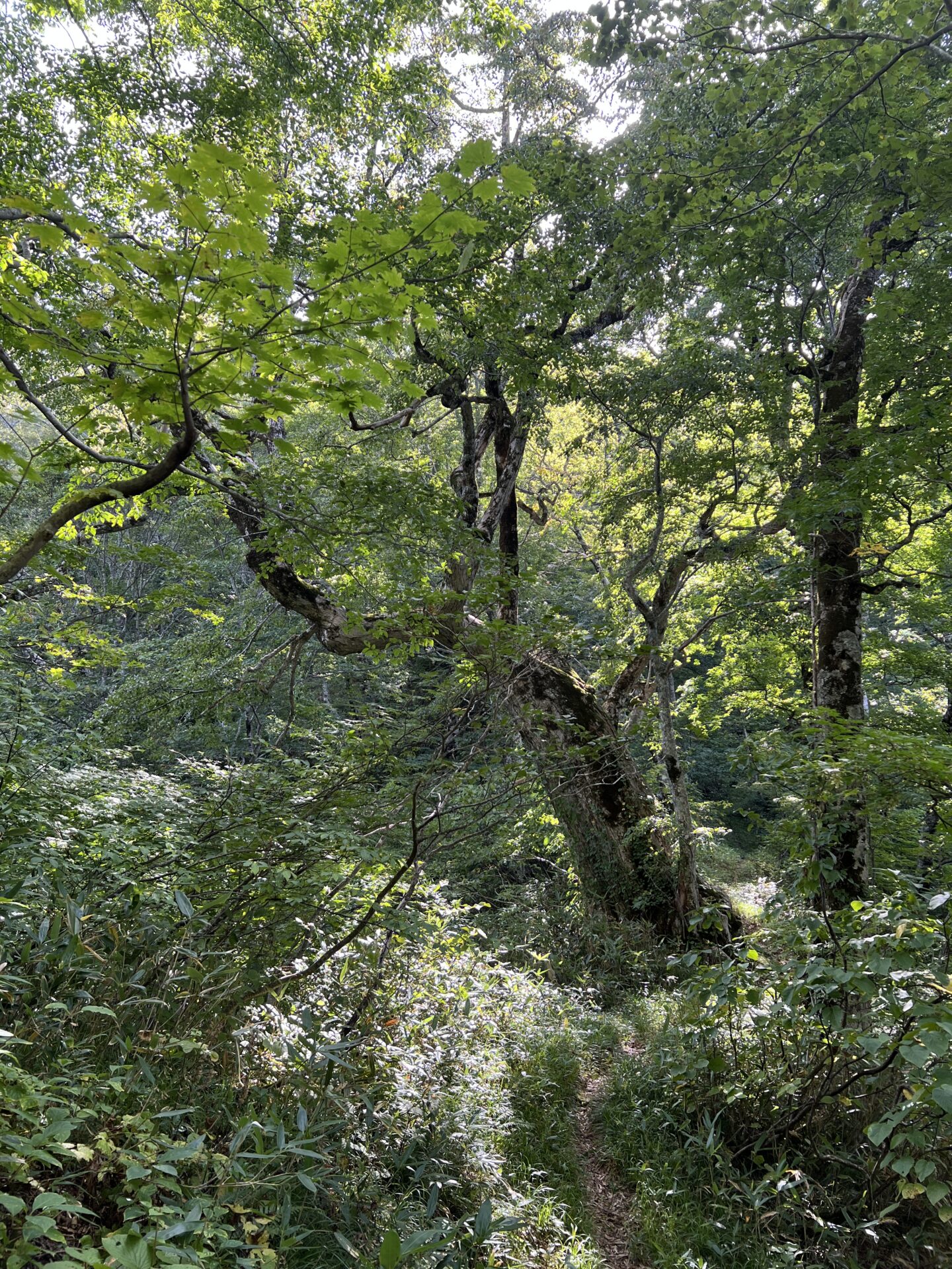 ブナ林の急なくだり、藪漕ぎの草原チクチク痛いゾーンがけっこうやっかいだった。