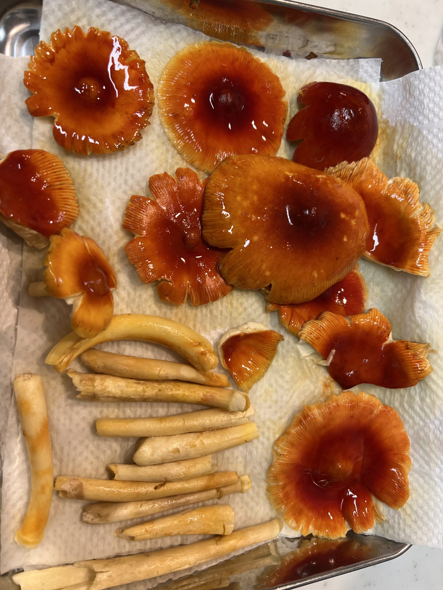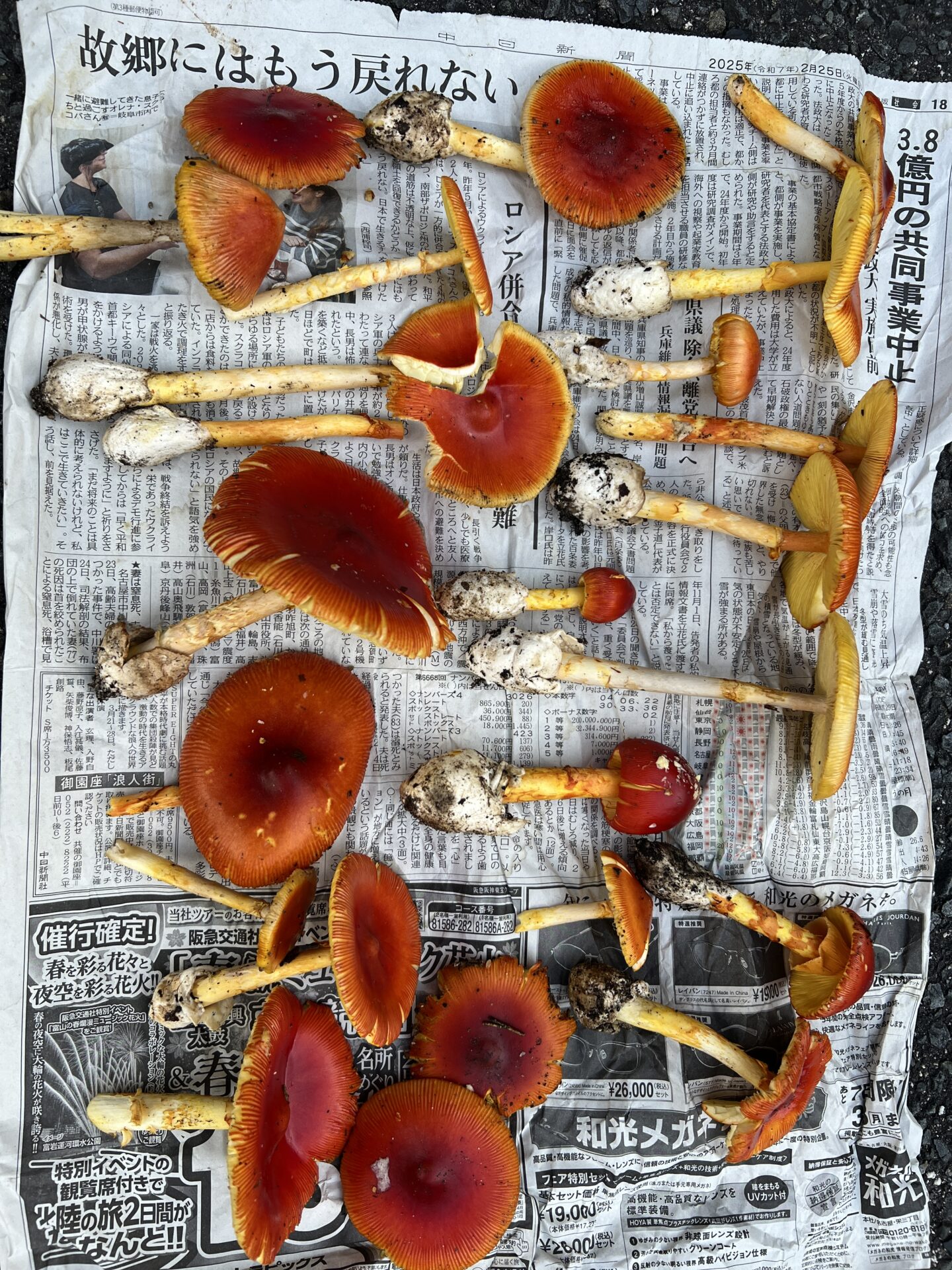 私ははじめてだったので下山後にもう一度タマゴタケであっているか確認のため全部を新聞紙の上に広げて一つ一つ確認しました。
