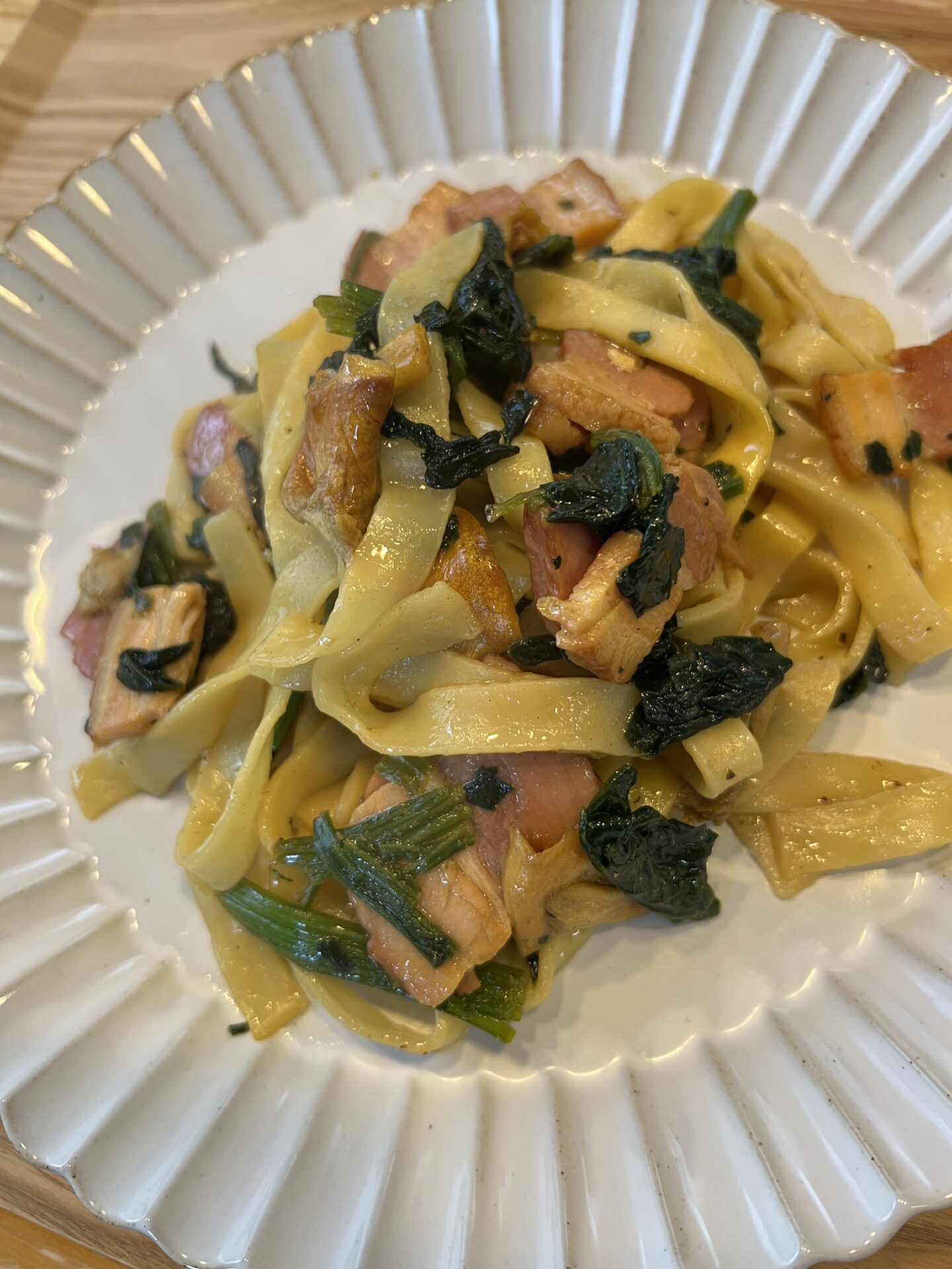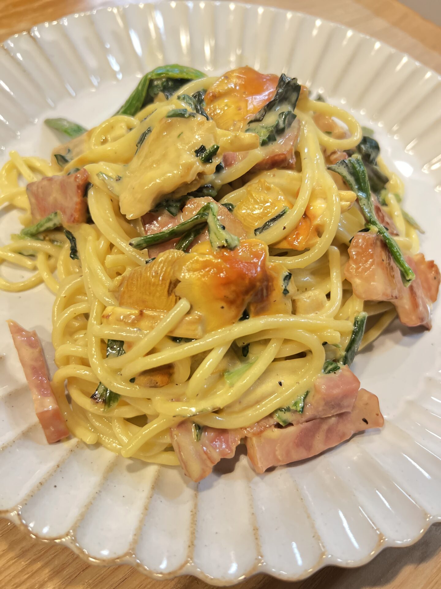洋風にカルボナーラ、和風に醤油ベースでと味を変えて。